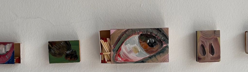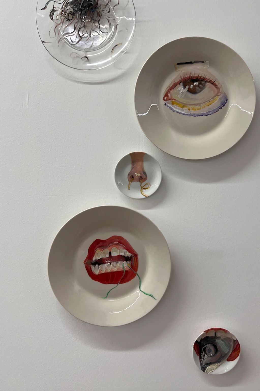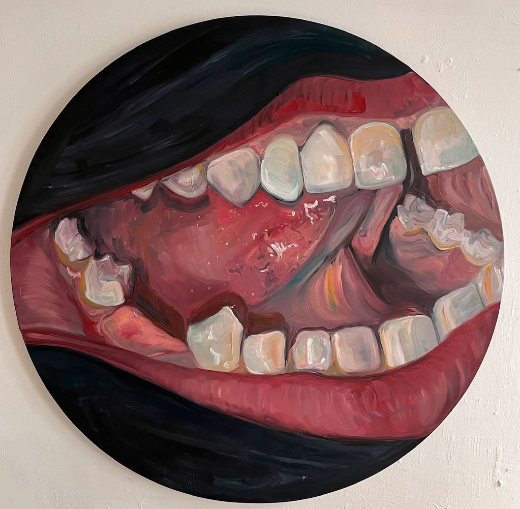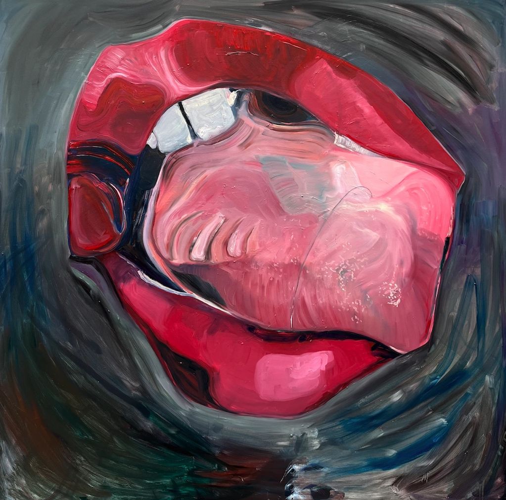 The painting “A hair in the mouth" is big format (170x170cm) like "A bug in the eye" (100cm diameter). In the case of the mouth in the distance, the image of the imposing mouth can be seen at first sight. But when one approaches the painting you manage to discover a detail that is the hair. It slides all over the tongue, causing the viewer to become overwhelmed and have feelings of nausea towards the painting. In the case of the eye, the round canvas favors the circular idea. As in the painting of the mouth, the eye can be seen from a distance, but when the viewer gets closer they can see the bug that is inside the painting. In both cases, the large-format paintings generate feelings of impact and many sensations.
