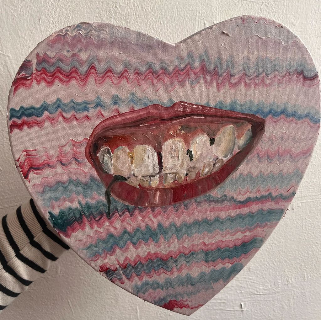 On the other hand, the painting of the mouth in the heart has a controversial idea of love. At first glance you can see the mouth and then you come to see the food in the teeth clearly in detail.