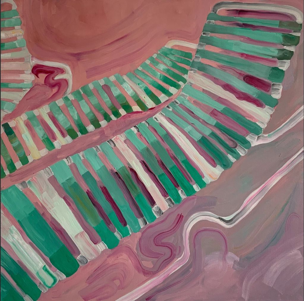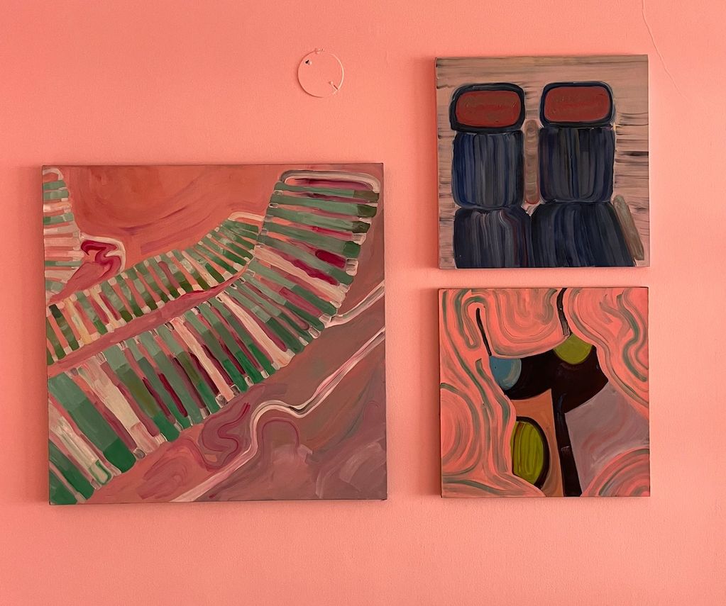 Esta técnica hace un guiño a la pintura gestual pero sin recurrir a las grandilocuencias de las tradiciones expresionistas abstractas (de hecho, la misma escala de las obras es contraria a ese referente) y, más bien, extrañamente acerca estas piezas a las exploraciones de las posibilidades ópticas de la imagen. El énfasis en los patrones formados por las pinceladas (y en cada pincelada misma) trae a la mente una versión artesanal del arte óptico, como también los juegos de figura y fondo, organizados a partir de dichos patrones. Estos efectos visuales nos llaman a desplazar nuestra mirada por la superficie de los cuadros, yendo de lo micro a lo macro, descubriendo en el proceso que las zonas amplias de color hacen eco de las pinceladas mismas.